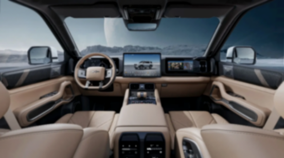 進入到駕駛艙之內,雖然官方還沒有把實車完全展示在外,但通過官圖,我們卻能夠在座艙中找到大量與豹5相似的家族式設計,比附四輻式方向盤、推桿造型電子換擋機構,還有對稱布局的中控三屏等等。當然,在車艙許多附件打造上,我們不光感受到了科技感,也從大量抓握扶手設計中看到了車輛的越野定位。