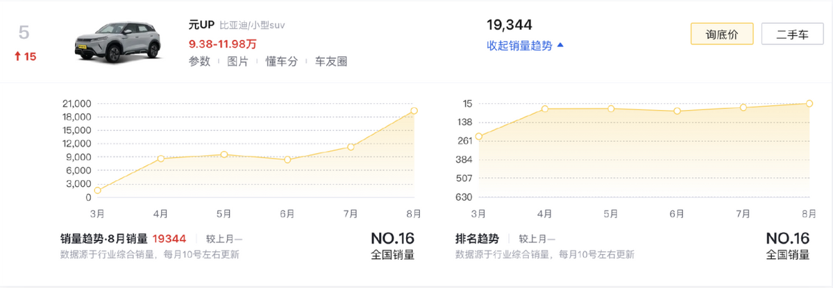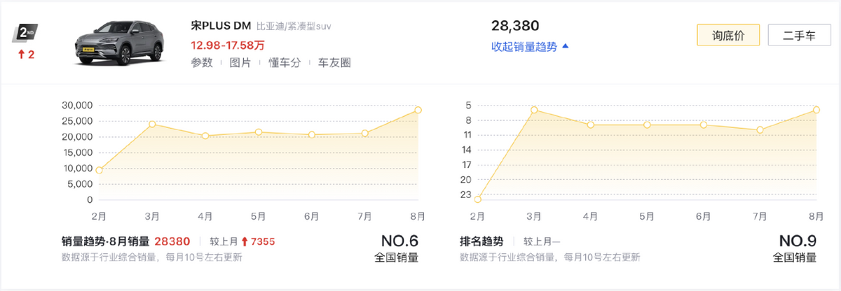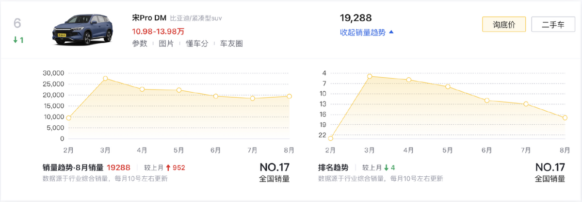 比亞迪元UP、宋Pro DM-i拿下了本月的第5名、第6名,前者是比亞迪在元家族升級到緊湊型SUV市場后,對于小型SUV市場的一個補充,CTB、e平臺3.0等一系列技術的加持,沒有讓它說顛覆小型SUV市場,但10萬以內拿下代步,而且還是一臺SUV,這對許多家庭來說本就已經是極具誘惑力的了。同時,比宋PLUS定位略低一些的宋Pro DM-i,同樣是主打分級策略,它能在確保空間、續航與能耗的情況下,有效壓低用戶的購車預算,而在第二代車型上市在即的情況下,這一代也會加大促銷力度。