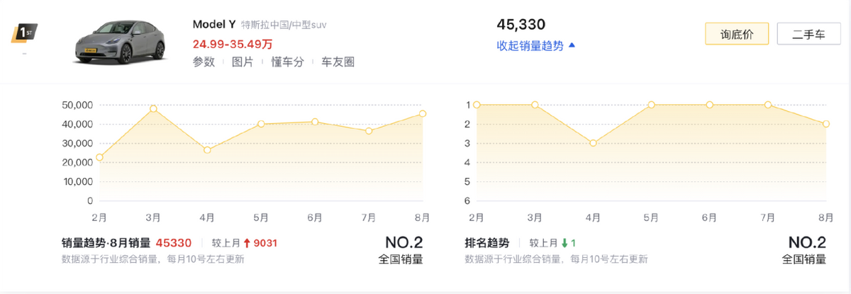 特斯拉Model Y沒有任何意外地排在了第1名,一直都在說特斯拉克星,自主新能源里與特斯拉價位相同、智能相近的新車不少,可Model 3是被拉下馬了,但這臺SUV依舊堅挺。盡管Model Y依舊是全系選裝高階智駕,可出色的性能、可靠的電池,還有足夠豐富的特斯拉車載系統、14揚聲器、真皮方向盤等配置,依舊能讓這臺Model Y憑借實用型智電SUV身份甩開身后競爭者。