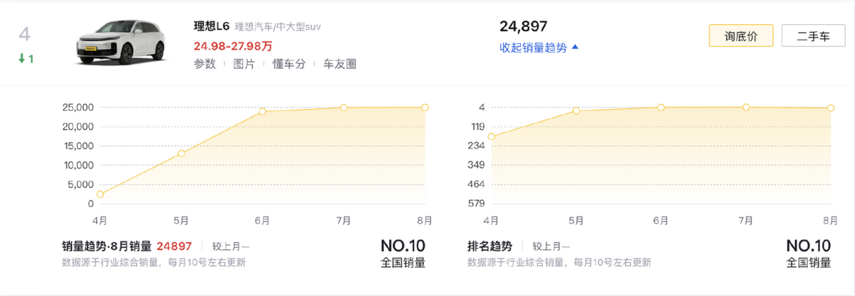 理想L6收獲了第4名,也是高端新能源里唯一月銷破2萬臺的車型,瞄準家庭用車市場是理想最成功的地方,而增程式帶來了的低油耗與更穩定的電驅表現,在前雙后五+可變懸架組合、全系高階智駕以及雙15.7英寸屏智能座艙的支撐下,理想L6不說是樣樣精通,但也做到了樣樣全能,一車兌現所有愿望,這就是理想的成功秘訣。