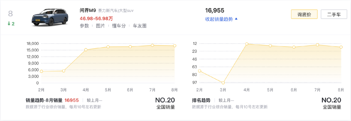 第7到10名的四款車型中,第8名的問界M9毫無疑問是最搶眼的。高達46.98萬元的起售門檻卻在銷售量超過了所有在華銷售的德系、日系SUV,用來描述“中國車崛起”再合適不過。可以說這臺車是華為智能汽車方案的集大成者,從HUAWEI xPixel大燈到HUAWEI SOUND,再到Hamony OS 4.0與全新升級的ADS 3.0,“全車華為”突出的就是一個豪華,先于蘋果汽車到來的“華為汽車”這一次是真的用智能終端的思維在造車,也造成功了。