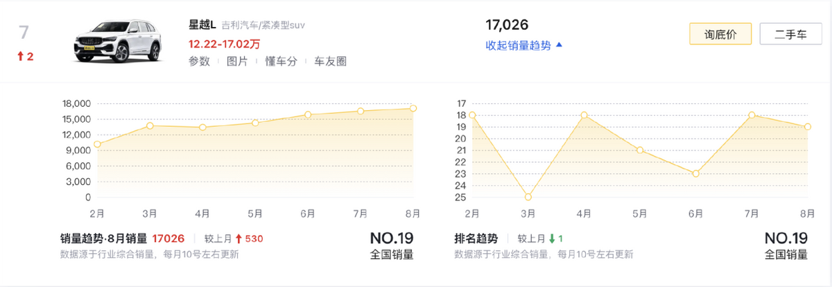 吉利星越L作為本月的第7名,也是TOP10中唯一一款不插電的國產SUV,全系2.0TD、可配愛信8AT,還有CMA架構的出身都在盡可能保障硬件上的高端,而在整合了高通驍龍8155、HUAWEI HiCar以及自家的吉利銀河OS 2.0之后,“非豪華SUV最豪華”的配置方案,也讓車輛在二三線市場中大放異彩。