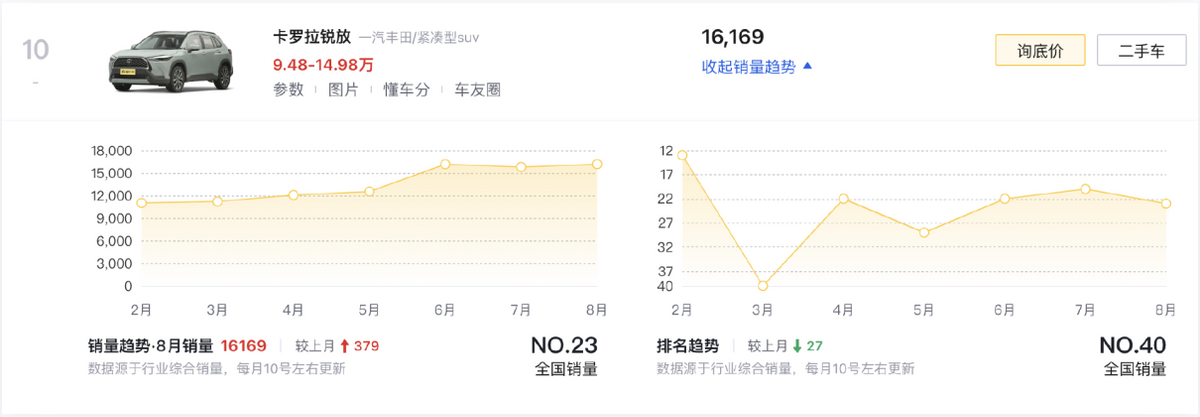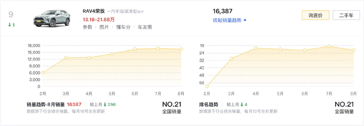 豐田RAV4榮放與卡羅拉銳放分別占據了第9名、第10名,一款是豐田在SUV市場的銷冠,一個是針對中國用戶打造的低價位特供車,豐田在保持固有競爭力的同時,也在本土市場發掘著有生力量,而且無論是RAV4榮放更為個性的探險版,還是卡羅拉銳放的2.0L智電雙擎版本,豐田多條腿走路也不失為一個求生的辦法。