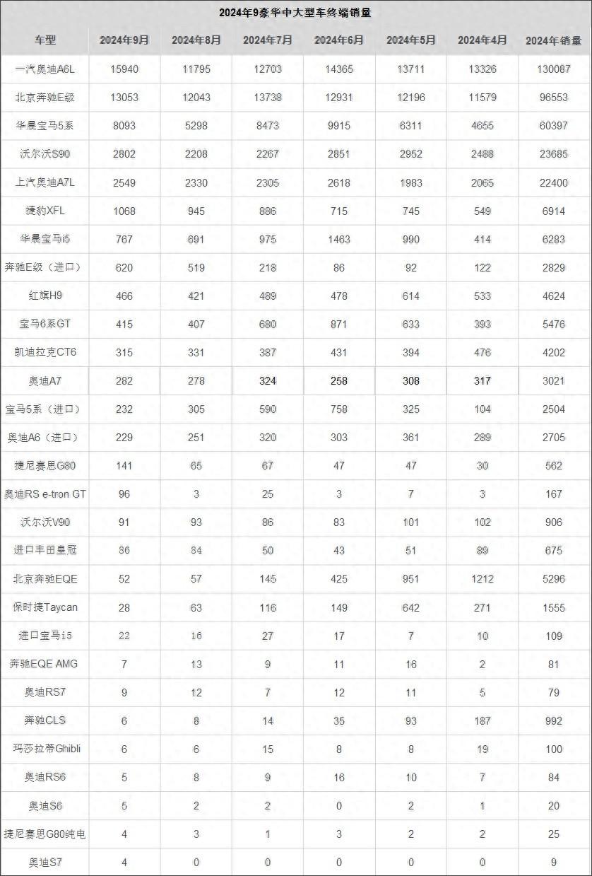 在2024年9月, 一汽奧迪A6L以15940輛的成績在細分市場領跑,其今年前9個月總銷量為130087輛,同樣是以較大的優(yōu)勢領跑,成為年度豪華中大型車銷量冠軍已經(jīng)無懸念。進口A6的9月終端銷量為229輛, 前9個月總銷量2705輛,市場存在感依舊不高,這與國內(nèi)市場旅行車屬于小眾車型有直接關系。上汽奧迪A7L憑借大幅度的現(xiàn)金優(yōu)惠,在不斷提升著銷量,9月終端銷量為2549輛,前9個月總銷量22400輛;進口A7的9月終端銷量為282輛,前9個月總銷量3021輛;銷量對比表明,長軸距和低價格是打動消費者的法寶。