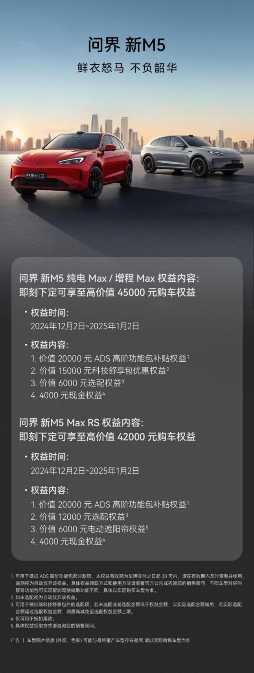 值得一提的是,2025年1 月 2 日之前下定問界新M5可享至高價值45000元購車權益,包括價值20000元的ADS高階功能包補貼權益、價值15000元的科技舒享包限時免費權益、價值6000元的選配權益、4000元的現金減免權益,同時還可享受至高價值4000元的智駕無憂服務,這意味著消費者購車更省錢省心,用車更安心無憂。