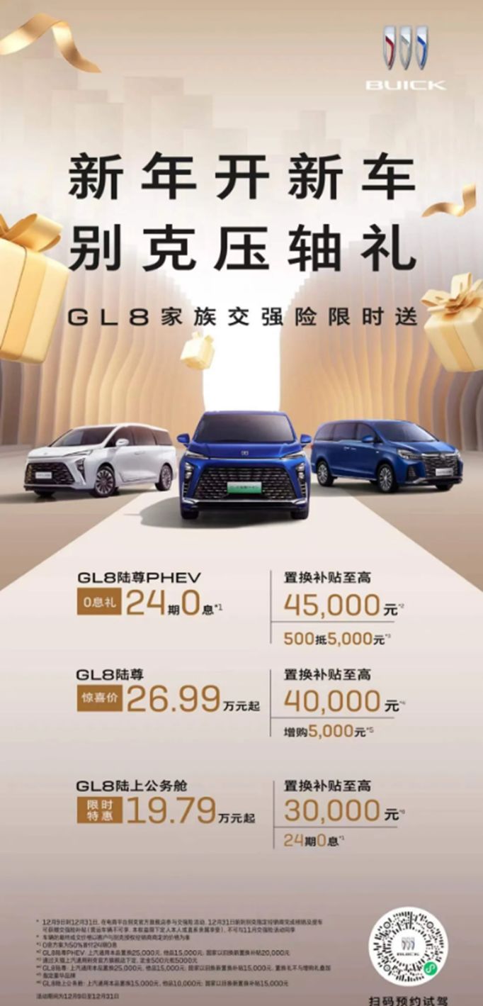 在選車時,產品綜合優惠是很多消費者較為關注的一環。別克GL8家族給出的政策就非常給力,無論是免息、置換補貼亦或是各種禮包都十分的超值有誠意。豪華金標MPV別克GL8 ES陸尊可繼續享受至高4萬元置換禮、5,000元增購補貼禮、24-60期低息低門檻金融禮以及5年5次保養等禮遇;GL8陸尊PHEV除了獲贈交強險外,可同時享受500元定金10倍膨脹禮、置換補貼至高4.5萬元、24期0息或低首付低門檻金融方案以及包括升艙禮、5年5次保養、首任非運營車主終身三電質保等尊享禮遇,而且12月購車最高可省超過13萬元;至于別克GL8陸上公務艙延續19.79萬元限時鉅惠起售價,更疊加24期0息及低首付低門檻金融方案,至高3萬元置換補貼等禮遇,可以說別克拉滿了誠意和優惠力度。