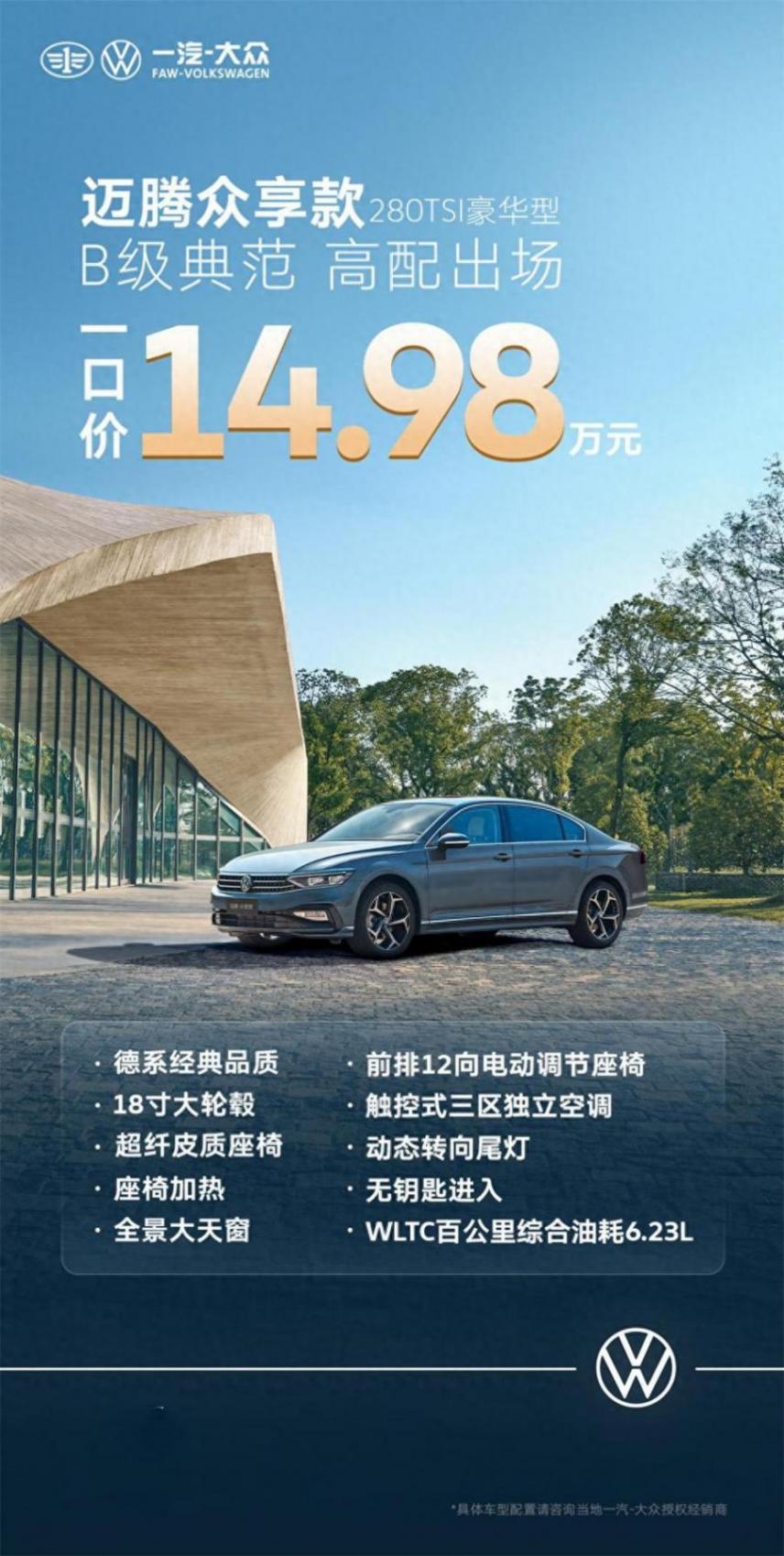 2025年,如何為消費者在卷到離譜的B級車市場中,提供一款極具性價比的優秀產品,一汽-大眾做出了表率,就在1月9日一汽-大眾正式推出了一口價僅14.98萬的,邁騰眾享款280TSI豪華型。
