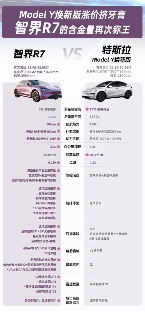 智界R7售價25.98萬起,而特斯拉Model Y煥新版目前國內(nèi)售價26.35萬元起,對比之下,智界R7售價要略低一些。但如果認真對比一下配置,就會發(fā)現(xiàn),盡管智界R7的售價更低,但其配置和體驗均遠遠超越Model Y。